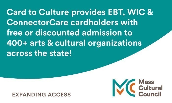 We are proud to participate in Mass Cultural Council’s Card to Culture program in collaboration with the Department of Transitional Assistance, the Department of Public Health’s WIC Nutrition Program, the Massachusetts Health Connector, and hundreds of organizations by making cultural programming accessible to those for whom cost is a participation barrier.